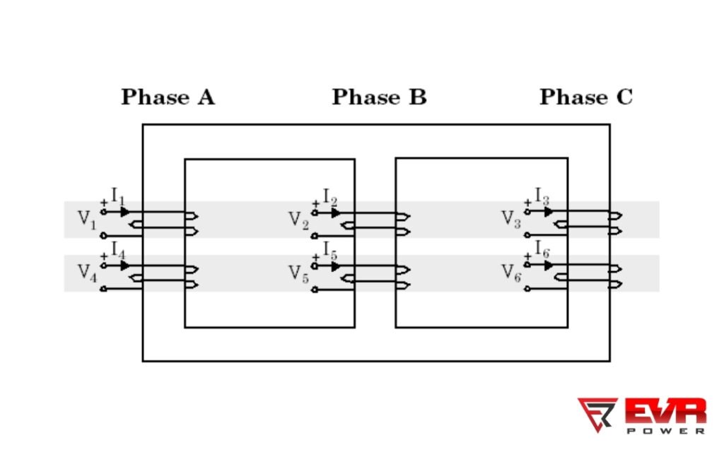 As the windings rotate through the magnetic field, the output current and voltage are generated. This is distributed through three separate lines (secondary) and hence called three-phase power transformers. It is represented by 3-phase or 3ɸ.