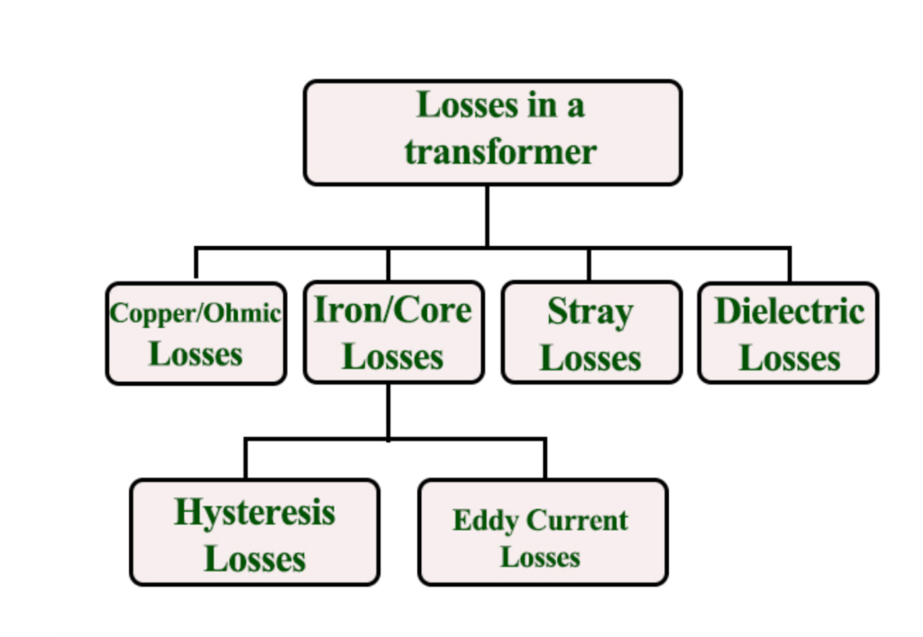 Transformer losses are categorized into core losses, caused by magnetic friction and eddy currents in the core, and copper losses, resulting from electrical resistance in the windings.